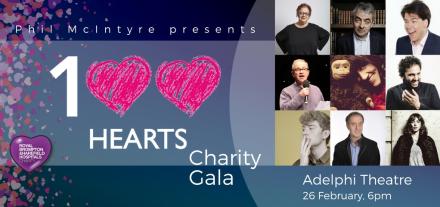 Rowan Atkinson, Jo Brand, Rob Brydon, Nina Conti, Harry Enfield, Paul Whitehouse and Michael McIntyre are among the acts performing at the 100 Hearts Charity Gala on Sunday 26 February. The show will be hosted by Clive Anderson at London's Adelphi Theatre. Tickets are on sale now.