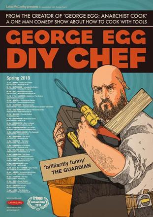George Egg: DIY Chef sees George relocated to the garden shed where his imagination and resourcefulness leads him to build an improvised kitchen. During an inspiring and inventive evening of stand-up, live cooking and comedy lecture George prepares a breakfast, a lunch and a dinner using, amongst other things, a wallpaper stripper, a heat gun, a paper shredder and a whole host of other power tools, office equipment, hair-dressing appliances and gardening implements. And the audience get to eat the food at the end.