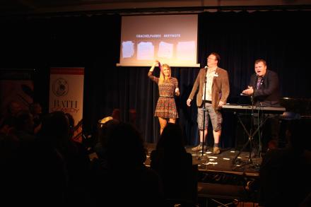 Pictured: Rachel Parris receives the Bath Plug from award organisers Nick Steel (Bath Comedy Festival Director) and Jem Roberts (comedy historian and author).