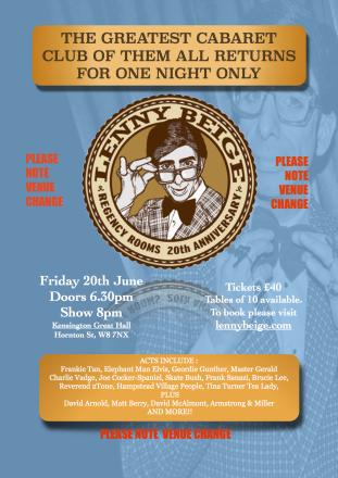 Lenny Beige did not retire completely when the club closed down. The lost lovechild of Anthony Newley still crops up here and there, but it is a long time since his classic club was in full swing. There were attempts to put The Regency Rooms on television. I think that at least one pilot was made. But the trouble was that you really had to be there. What was that? You weren’t Well you can put that right on June 20.