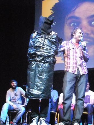The man with the hood over his head is the Alex Horne lookalike brought onstage at great expense by Tim Key. Read the article in The i to find out more.