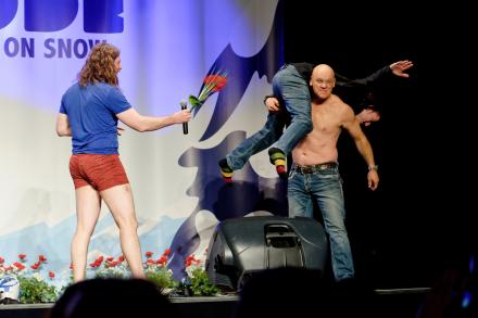 has been shouting onstage for the last two decades. But the biggest surprise was how good comedians are at skiing and snowboarding. Maybe they have too much time on their hands during the day and gets lot of practice. Or maybe this is something to do with having good timing and rhythm. Or maybe it takes the same fearlessness to fling yourself down a near-vertical mountain as it does to stand on a stage and try to make strangers laugh, but most of the comedians in Mayrhofen seemed as confident on snow as they are onstage.